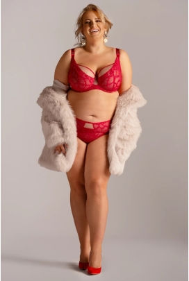 Miękkie miski o jednym cięciu pionowym i poziomym skośnym typu soft lace, oparte na fiszbinach. Mostek klasycznej wysokości. Z zewnątrz pokryty czerwoną koronką, która doskonale została wyeksponowana na beżowym podkładzie. Sprężysty, dobrze pracujący pas obwodu pozbawiony bocznych fiszbinów, co zwiększa komfort w trackie użytkowania. Ramiączka ozdobione złotymi regulatorami i aplikacją. Tył zapinany na haftki o trzystopniowej regulacji. Konstrukcja przeznaczona na średnie i obfite biusty. Tylko dobrze dobrany rozmiar zapewni optymalne podtrzymanie biustu unosząc go wysoko ku górze zbierając maksymalnie do środka.