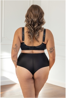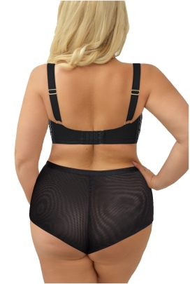 Miski miękkie typu minimizer, oparte na fiszbinie wykonane z bardzo komfortowej dzianiny, która nie posiada cięć. Górna część miski elastyczna wzbogacona o poddającą się lamówkę, która da poczucie stabilności jak i niweluje ewentualną asymetrię biustu. Dolna część bardziej stabilna ukształtuje biust zgrabnie nie uwydatniając go. Pas obwodu mocny, elastyczny bez wbudowanych plastikowych fiszbinów bocznych, co zwiększa komfort w trakcie użytkowania. Tył zapinany na trzy rzędy haftek o czterostopniowej regulacji. Ramiączka nieodpinane, regulowane na całej długości.