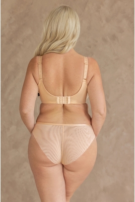 Miska miękka oparta na fiszbinie z niskim mostkiem o dwóch cięciach pionowych i poziomym skośnym z wszytym side-support dla lepszego zebrania biustu spod pach i skierowania go bliżej środka. Górna część miski wykończona elastyczną lamówką , która idealnie przylega do piersi. Na miski jest nałożona koronka. Dolna część miski wzmocniona delikatną laminacją od wewnątrz. Pas obwodu stabilny z elastycznej siatki pozbawiony bocznych fiszbinów, co zwiększa komfort w trakcie użytkowania. Ramiączka regulowane na całej długości bez możliwości odpięcia, wzmacniane i poszerzane w większych rozmiarach. Zapinany na dwa lub trzy rzędy haftek o trzystopniowej regulacji w zależności od rozmiaru. Polecamy figi do kompletu