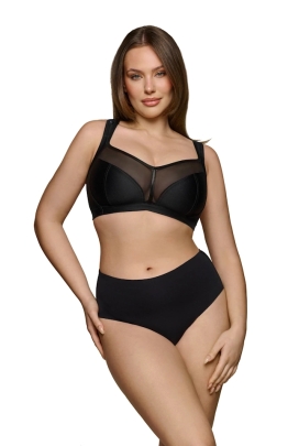 Miska miękka oparta na fiszbinie z niskim mostkiem o jednym cięciu pionowym i poziomym skośnym. Górna część miski wykonana z elastycznej koronki, która świetnie dostosowuje się do ciała i niweluje ewentualną asymetrię biustu. Od rozmiaru GG podszyta dodatkową warstwą materiału dla stabilizacji konstrukcji. Dolna część miski wzmocniona delikatną laminacją od wewnątrz. Pas obwodu stabilny z elastycznej siatki pozbawiony bocznych fiszbinów bocznych, co zwiększa komfort w trakcie użytkowania. Ramiączka regulowane na całej długości bez możliwości odpięcia, wzmacniane i poszerzane w większych rozmiarach. Zapinany na dwa rzędy haftek o trzystopniowej regulacji. Polecamy figi do kompletu w różnych fasonach.