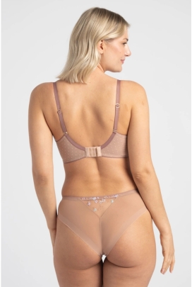 Model pocket-up czyli wkładki w kieszonkach. Miski biustonosza delikatnie usztywniane o jednym cięciu pionowym, dość płytkie, oparte na fiszbinach. Górna część wykończona elastyczną koronką, która świetnie dostosuje się piersi. Wkładki push-up wyciągane, umocowane na taśmie aby nie zaginęły, doskonała propozycja aby zniwelować ewentualną asymetrię biustu lub odrobinę go powiększyć. Pas obwodu pozbawiony bocznych fiszbinów, co zwiększa komfort w trakcie użytkowania. Ramiączka regulowane w całości, zdobne, nieodpinane. Zapięcie na 2 lub 3 rzędy haftek. Tylko dobrze dobrany rozmiar zapewni potrzymanie biustu unosząc go wysoko ku górze.