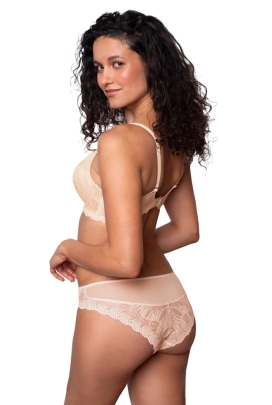 Model pocket-up czyli wkładki w kieszonkach. Miski biustonosza delikatnie usztywniane o jednym cięciu pionowym, na fiszbinach, dość płytkie. Górna część wykończona elastyczną koronką, która świetnie dostosuje się piersi. Wkładki push-up wyciągane, umocowane na taśmie aby nie zaginęły, doskonała propozycja aby zniwelować asymetrię biustu lub odrobinę go powiększyć. Ramiączka regulowane w całości, zdobne, nieodpinane. Zapięcie na 2 lub 3 rzędy haftek. Tylko dobrze dobrany rozmiar zapewni potrzymanie biustu unosząc go wysoko ku górze.