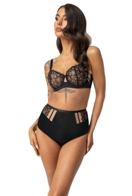 Miski miękkie typu full-cup oparte na fiszbinie, o jednym cięciu poziomym skośnym, jednym pionowym wraz z panelem side-support, który zapewnia zebranie całej piersi spod pachy. Górna część miski tiulowa wzbogacona o haft i lamówkę da poczucie stabilności. Dolna część podszyta dodatkową warstwą tiulu dla lepszego wsparcia biustu. Mostek średniej wysokości. Pas obwodu mocny, elastyczny z wbudowanym plastikowym fiszbinem bocznym, który zapobiega rolowaniu się obwodu. Zapinany na trzy rzędy haftek o czterostopniowej regulacji. Ramiączka nieodpinane, regulowane na całej długości.