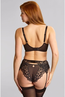 Wykonany z wysokiej jakości koronki delikatnej i przyjemnej w dotyku. Tył zapinany na haftki o trzystopniowej regulacji. Łapki trzymające pończochy regulowane. Intrygująca koronka, czerń muśnięta beżem- to doskonały klasyk, który wznieci temperament. Odrobina namiętności i chwila szaleństwa, którą możesz sobie podarować. Stwórz swój wymarzony komplet z linią Allure- bogaty wybór w modelach.