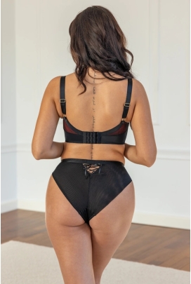 Miski miękkie typu half-cup oparte na fiszbinie, o dwóch cięciach pionowych z wszytą kieszonką wewnątrz miseczki (side-support), która zapewnia zebranie całej piersi spod pachy. Całość wykonana z tiulu wzbogaconym przepięknym, eleganckim haftem da poczucie stabilności. Mostek średniej wysokości z dodanymi paseczkami ozdobnymi z możliwością regulacji jak i odpięcia, które wyeksponują dekolt. Pas obwodu mocny, elastyczny z wbudowanym plastikowym fiszbinem bocznym, który zapobiega rolowaniu się obwodu. Zapinany na trzy rzędy haftek o czterostopniowej regulacji. Ramiączka nieodpinane, regulowane na całej długości.